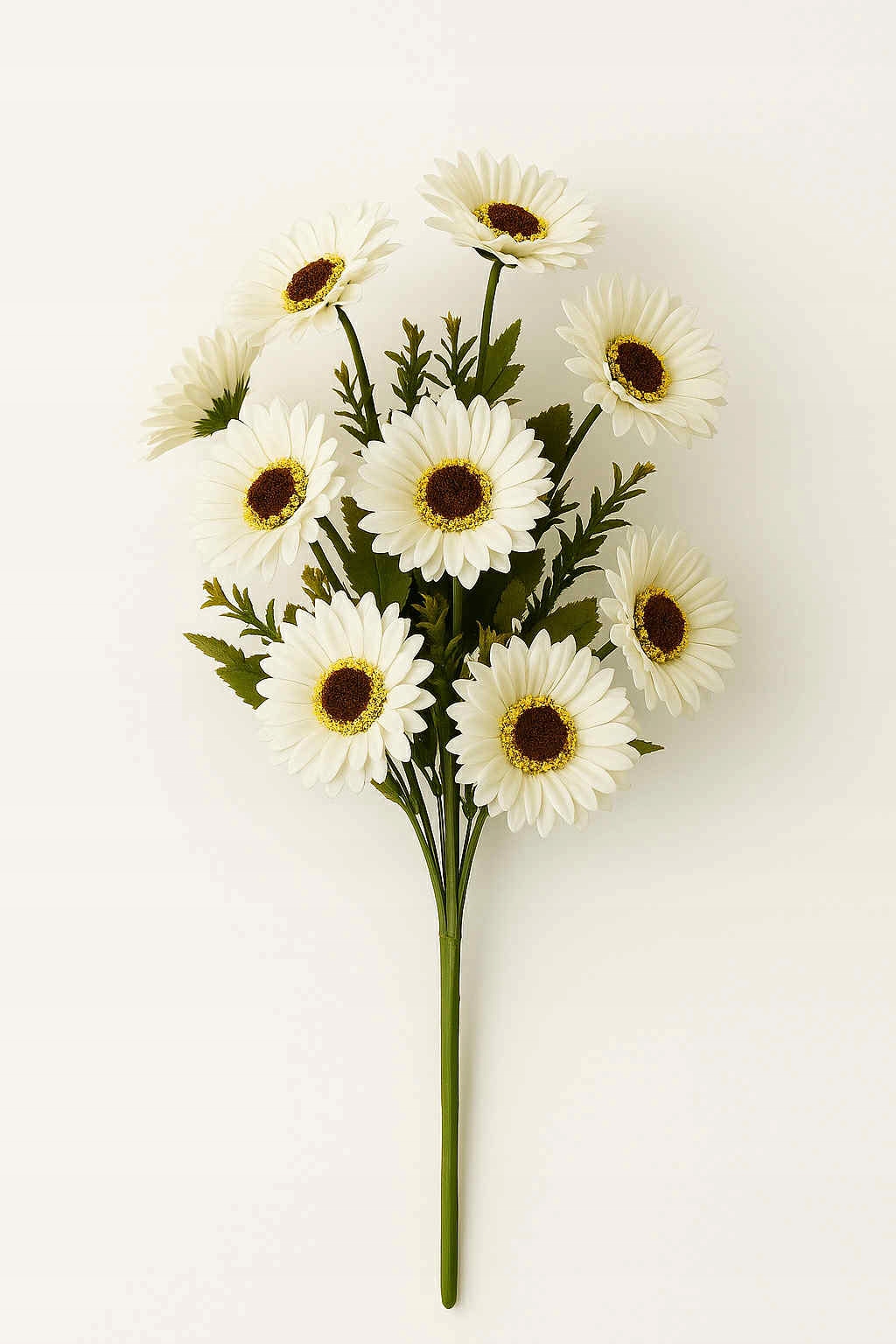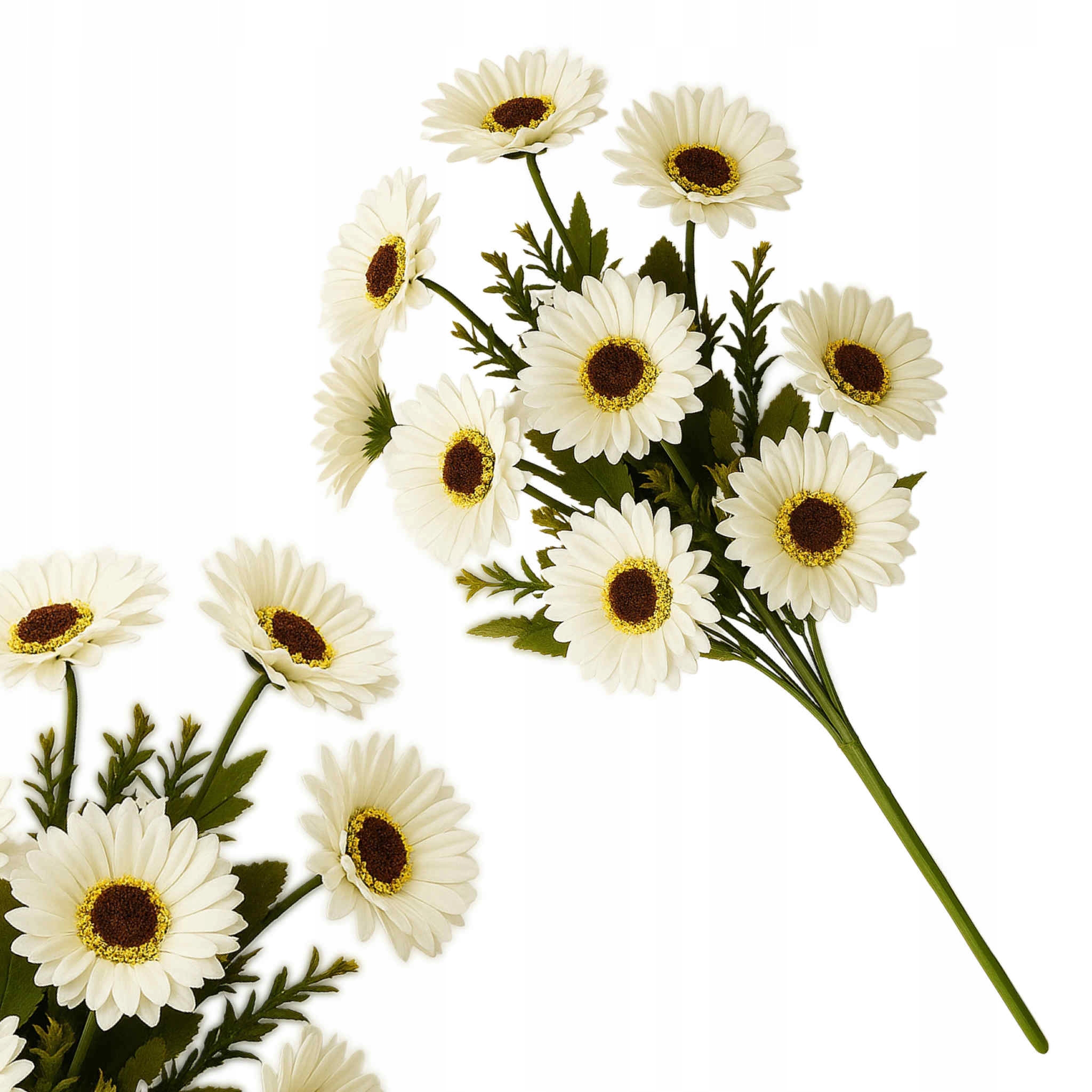 Piękny bukiet sztucznych gerber w intensywnym, białym kolorze to doskonały sposób na ożywienie wnętrza. Bukiet ma długość 43 cm i składa się z 9 starannie wykonanych kwiatów, które wyglądają niezwykle naturalnie. Realistyczne płatki i soczysta barwa sprawiają, że bukiet prezentuje się efektownie zarówno w nowoczesnych, jak i klasycznych aranżacjach.