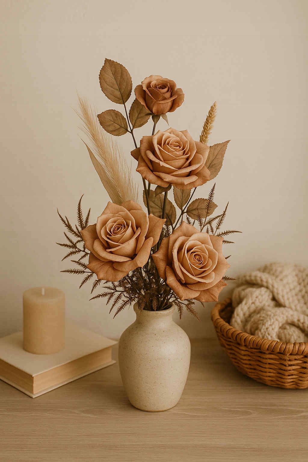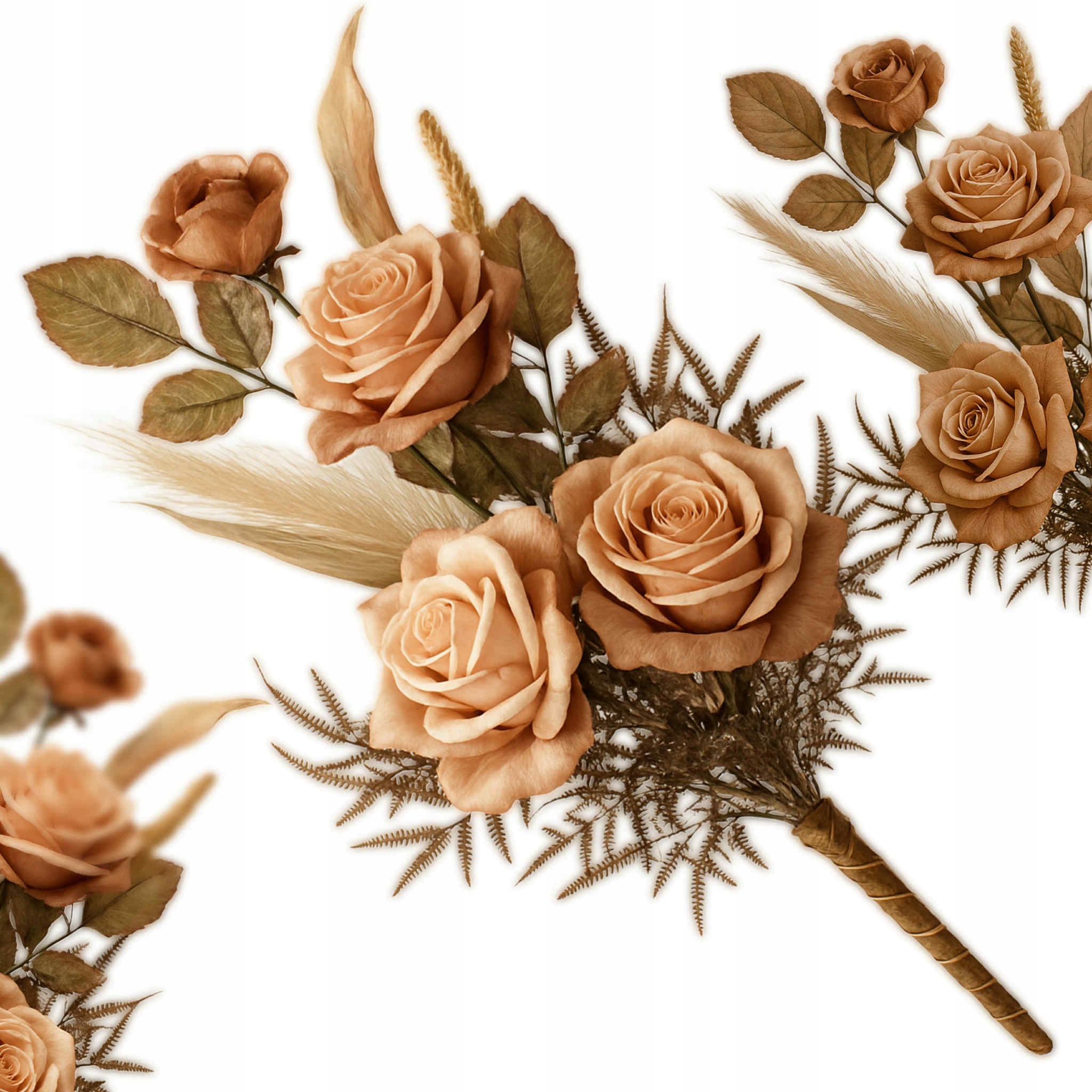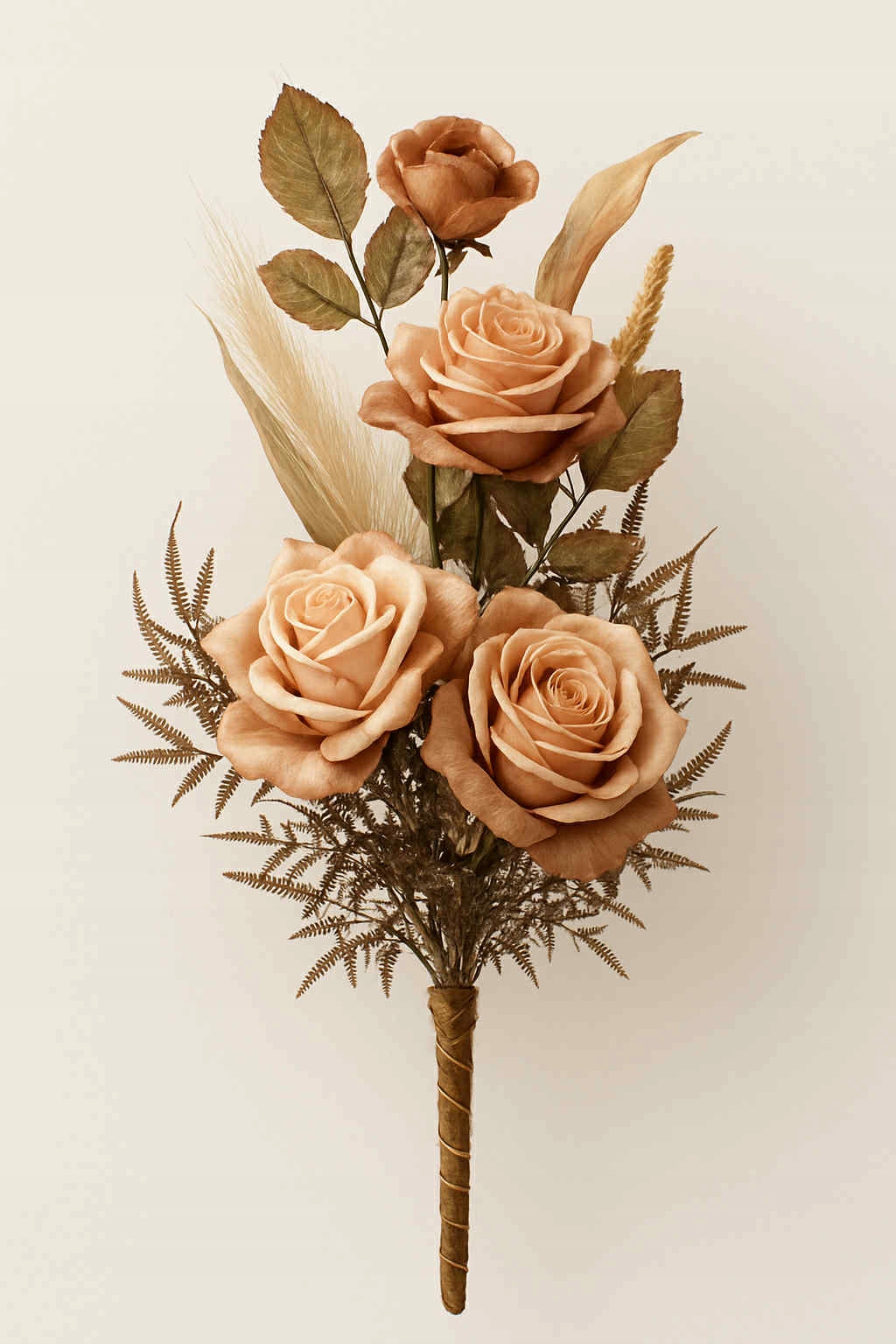Wysokiej jakości bukiet dekoracyjny o długości ok. 70 cm, utrzymany w rustykalnym stylu. Kompozycja składa się z pięciu realistycznych sztucznych róż w odcieniach beżu i brązu, uzupełnionych delikatnymi suszonymi trawami, zbożami oraz drobnymi listkami i paprociami. Całość została ręcznie połączona i starannie owinięta materiałową tasiemką w dopasowanym kolorze, co nadaje bukietowi elegancji i gotowego wyglądu – bez potrzeby dodatkowego układania.
