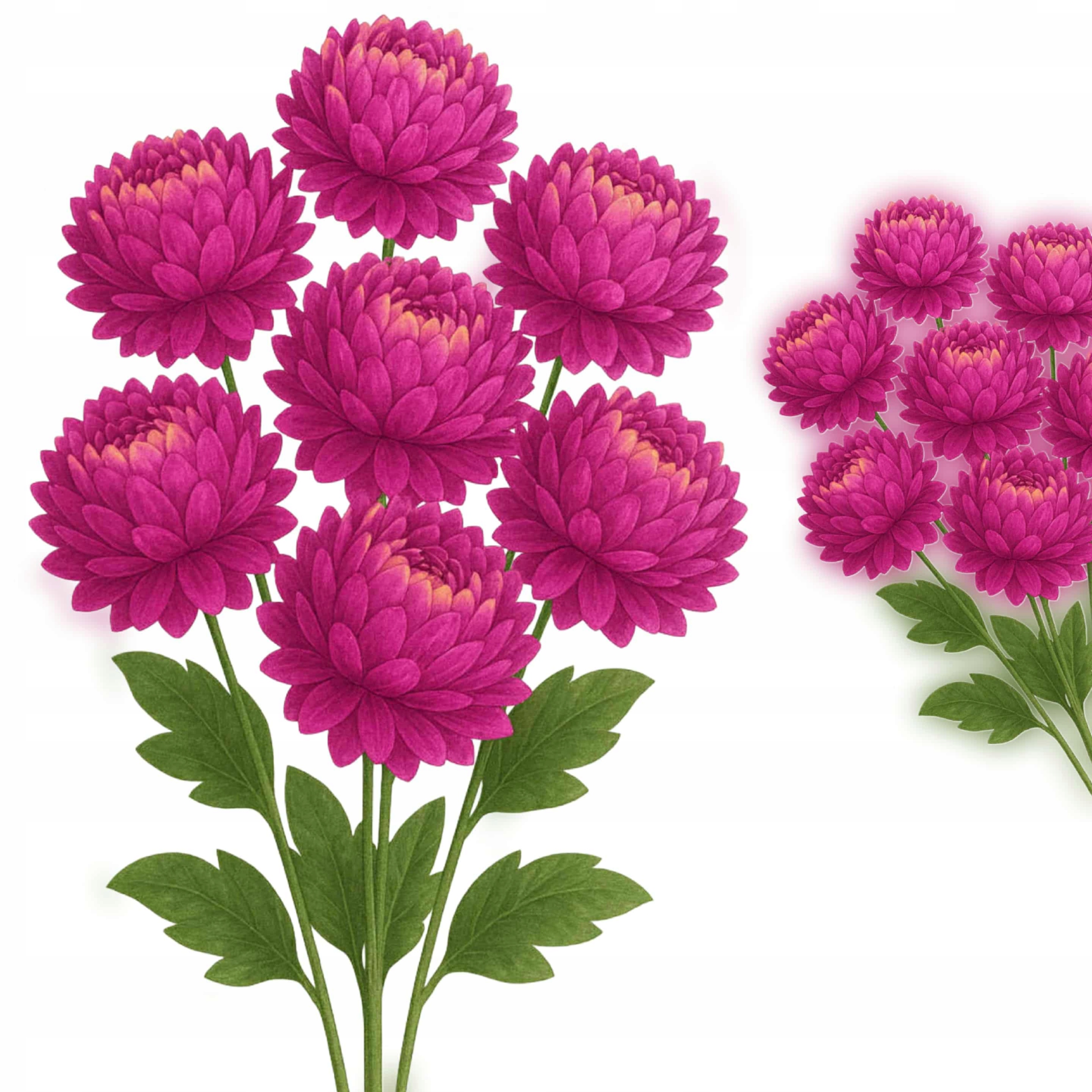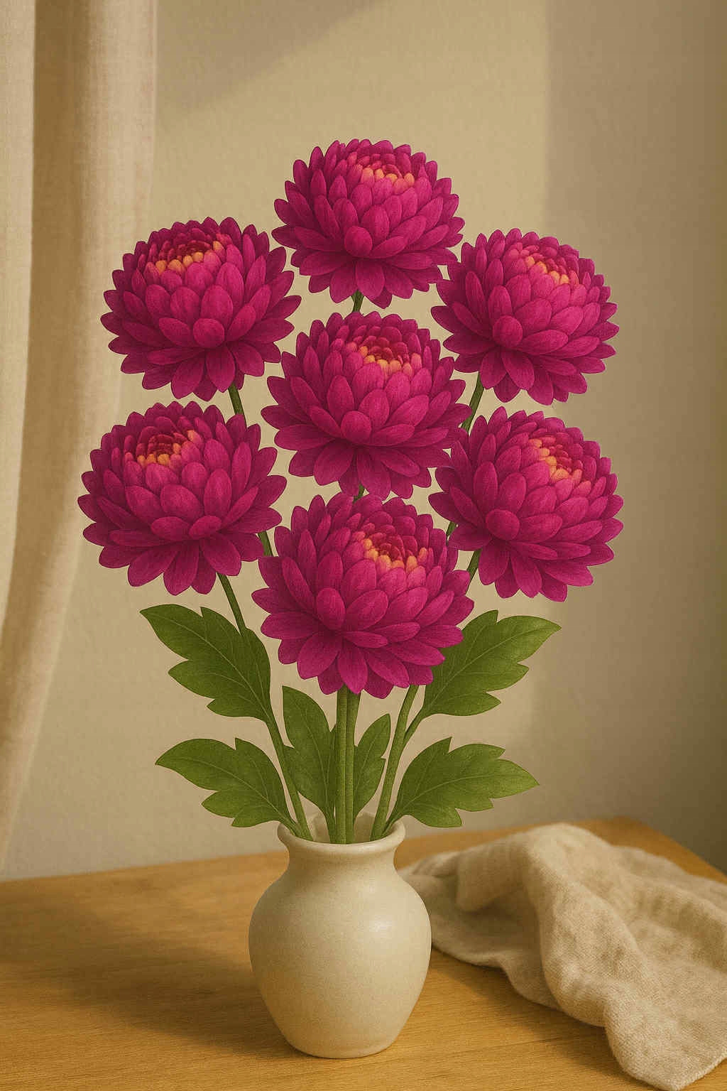 Efektowny bukiet sztucznych chryzantem o wysokości 75 cm to wyjątkowa dekoracja, która zachwyca pełnią koloru i perfekcyjnym kształtem. Każda z 7 dużych główek ma imponującą średnicę 20 cm, dzięki czemu bukiet wygląda bardzo naturalnie i okazale.