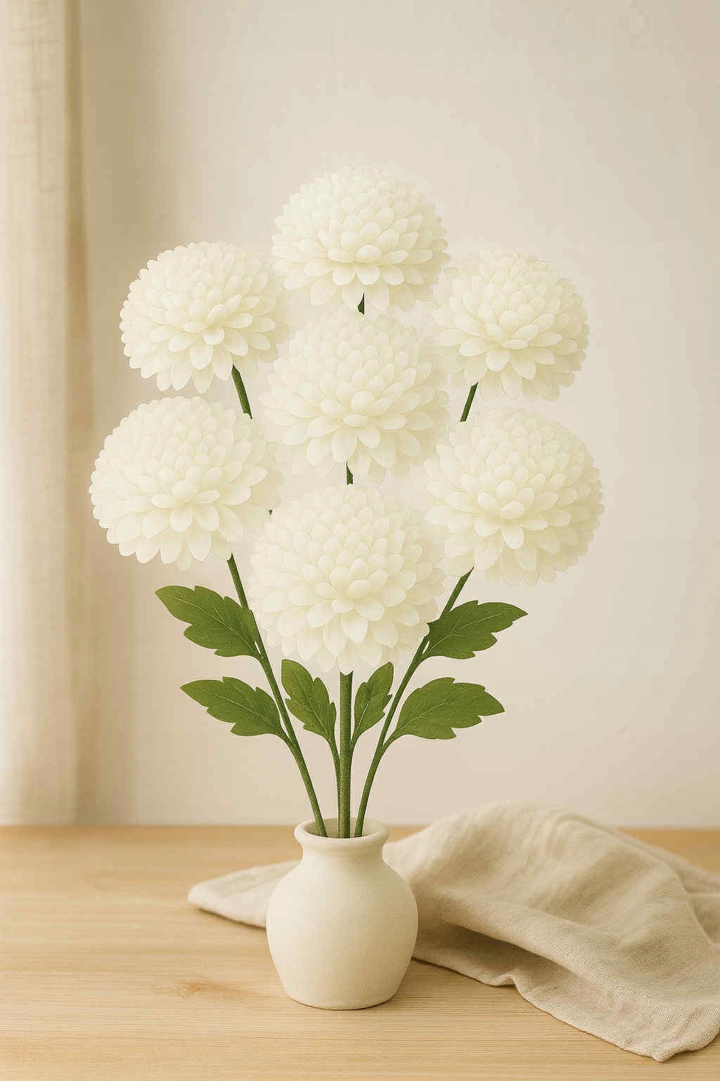 Efektowny bukiet sztucznych chryzantem o wysokości 75 cm to wyjątkowa dekoracja, która zachwyca pełnią koloru i perfekcyjnym kształtem. Każda z 7 dużych główek ma imponującą średnicę 20 cm, dzięki czemu bukiet wygląda bardzo naturalnie i okazale.