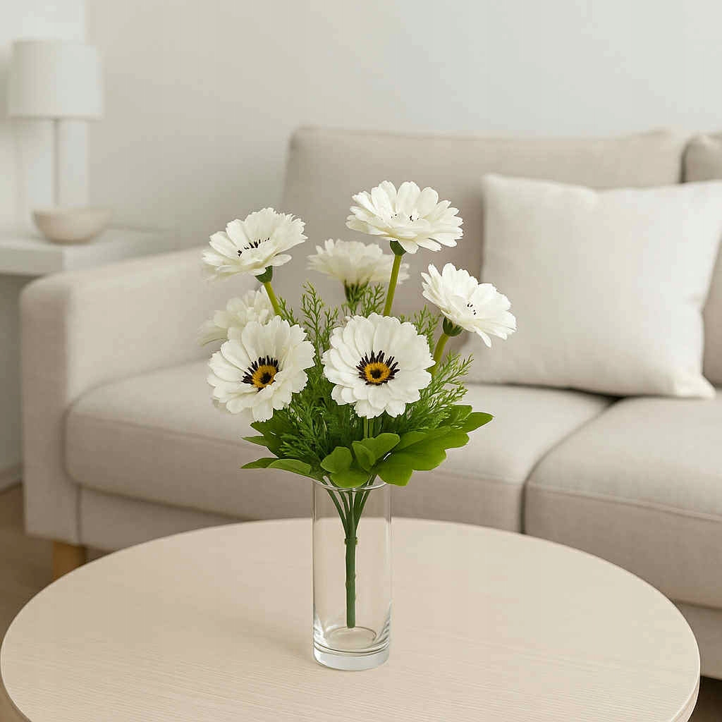 Kompozycja składa się z 10 realistycznych kwiatów osadzonych na giętkich łodyżkach, uzupełnionych zielonymi liśćmi i drobną roślinnością dekoracyjną. Bukiet prezentuje się naturalnie i estetycznie, idealnie pasując do różnego rodzaju wnętrz.