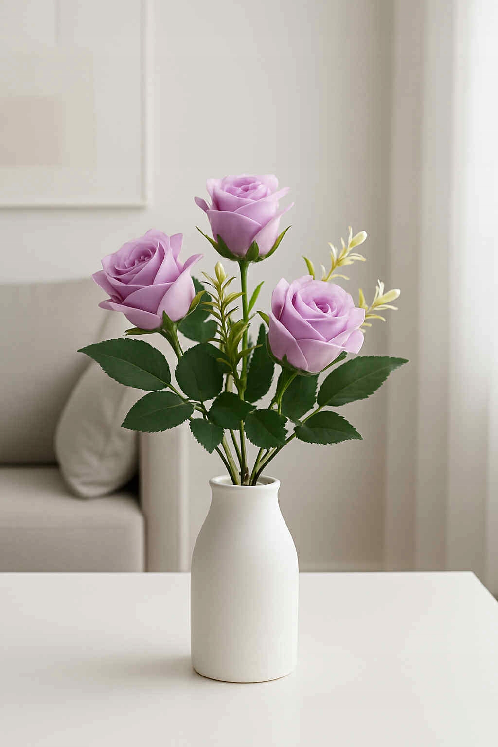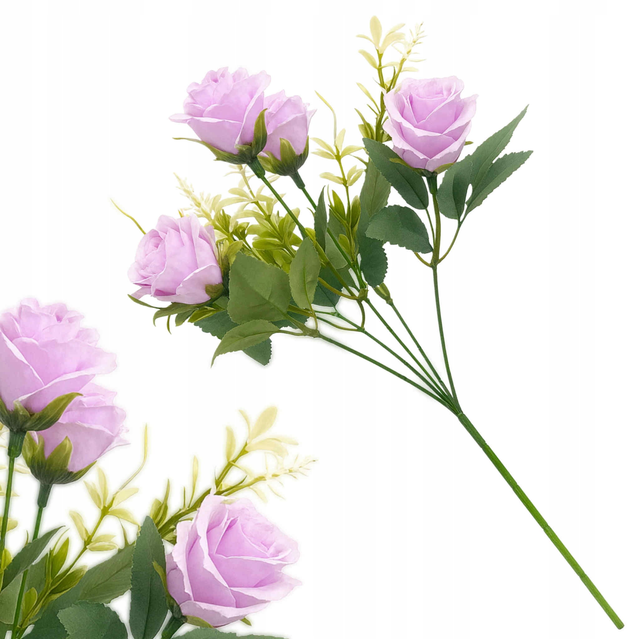 Bukiet składa się z 5 realistycznych główek róż o pełnym, naturalnym kształcie, uzupełnionych zielonymi listkami oraz delikatnymi akcentami dekoracyjnymi. Całość osadzona jest na giętkich łodyżkach, co umożliwia łatwe modelowanie i dopasowanie do wazonu czy dekoracji.