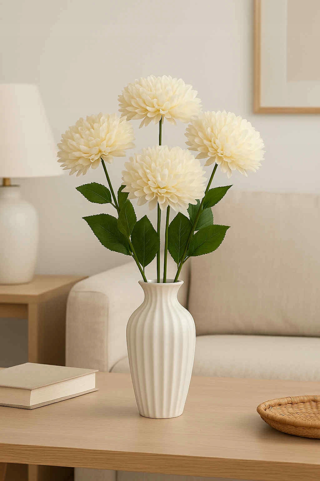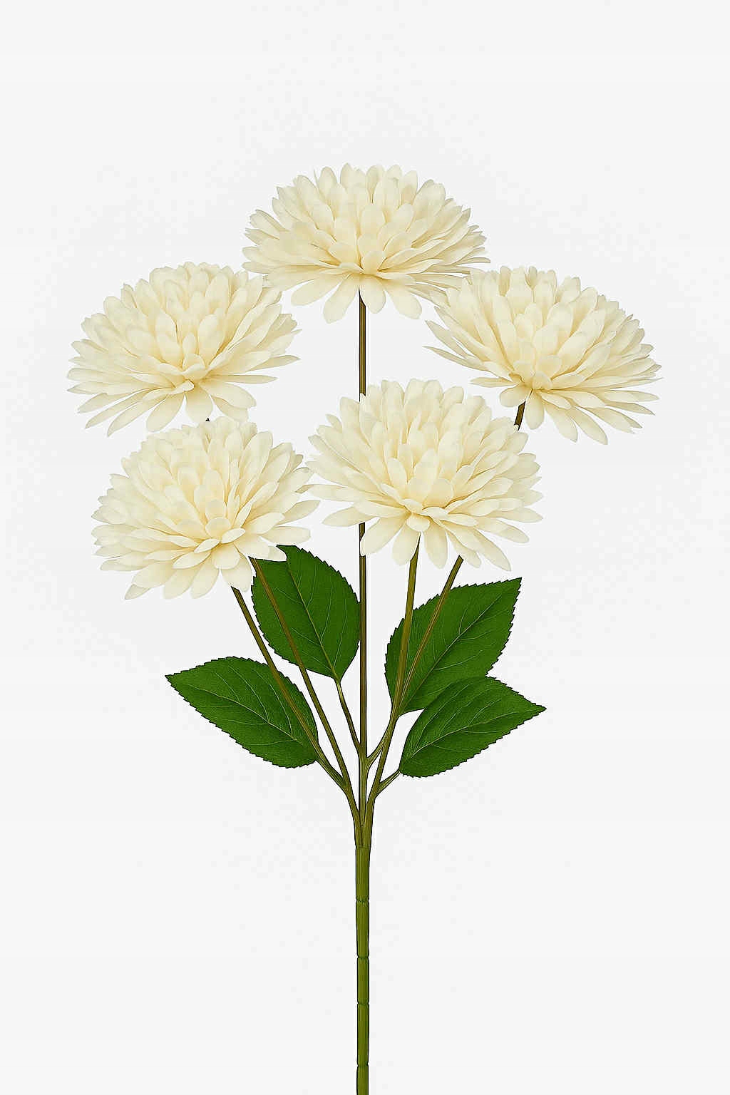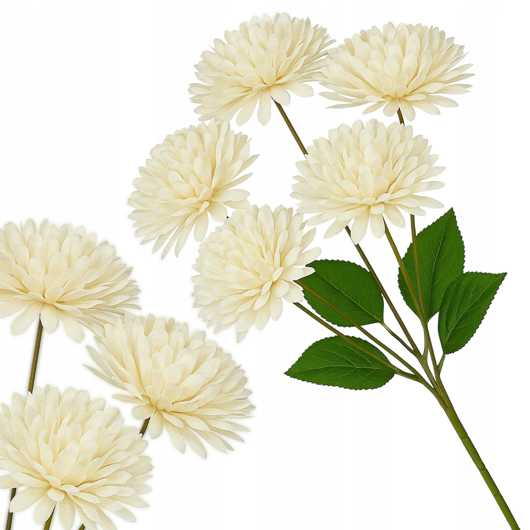 Elegancka gałązka dekoracyjna o długości 43 cm złożona z 5 dużych, pełnych główek chryzantem w białym kolorze. Kwiaty wykonane są z wysokiej jakości materiałów, dzięki czemu prezentują się niezwykle realistycznie i efektownie.