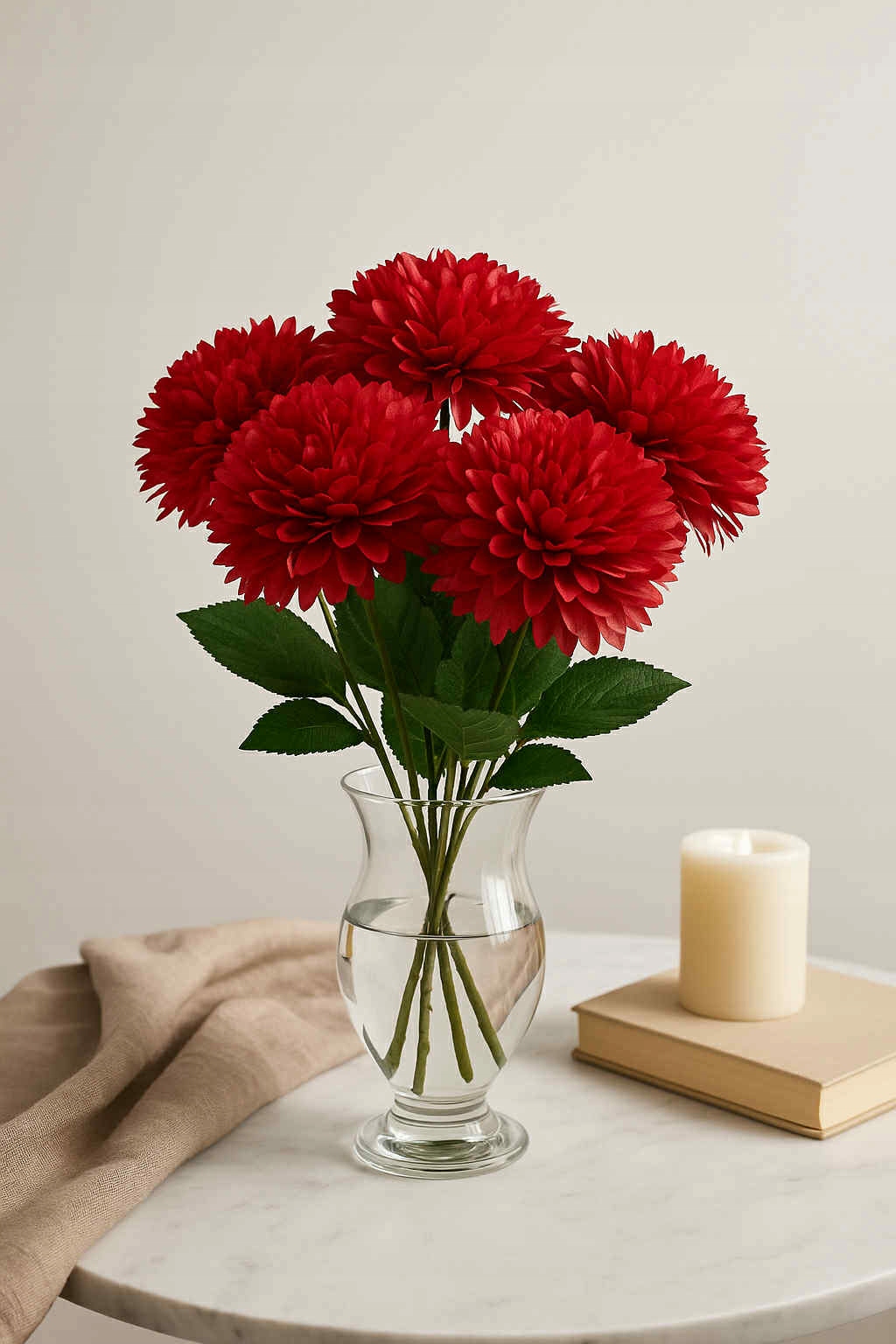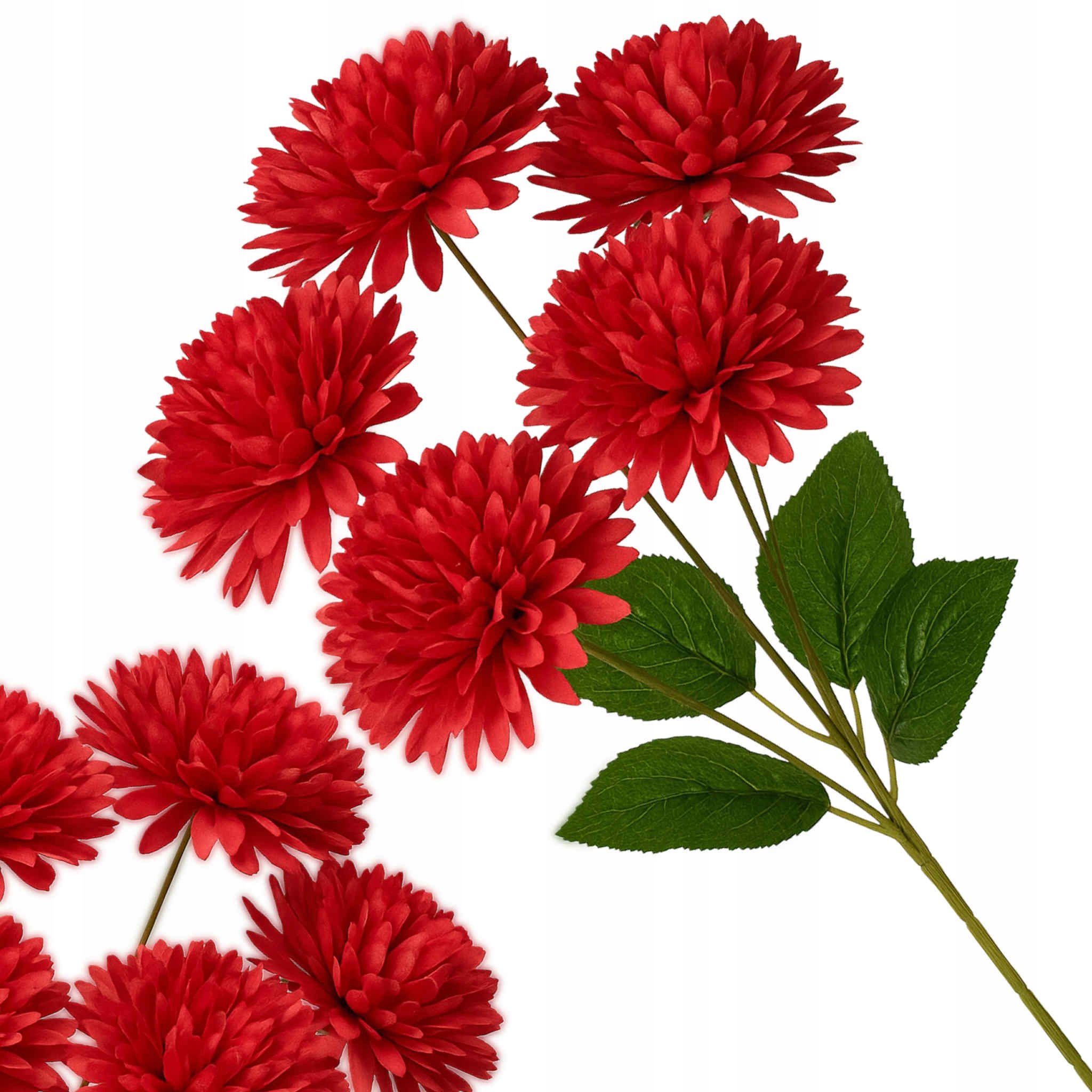 Elegancka gałązka dekoracyjna o długości 43 cm złożona z 5 dużych, pełnych główek chryzantem w czerwonym kolorze. Kwiaty wykonane są z wysokiej jakości materiałów, dzięki czemu prezentują się niezwykle realistycznie i efektownie.