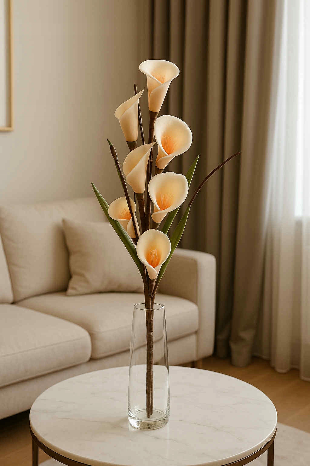 Elegancka gałązka sztucznych kalii o długości 108 cm to wyjątkowa dekoracja, która doda klasy i świeżości każdemu wnętrzu. Kwiaty wykonane są z wysokiej jakości pianki, dzięki czemu wyglądają niezwykle naturalnie – ich subtelny kształt i delikatny odcień przyciągają wzrok i doskonale imitują żywe rośliny.