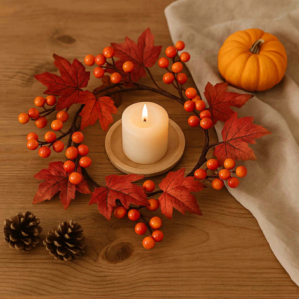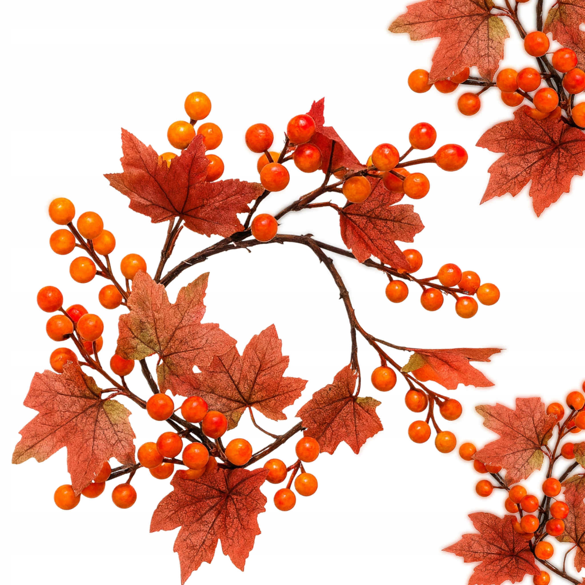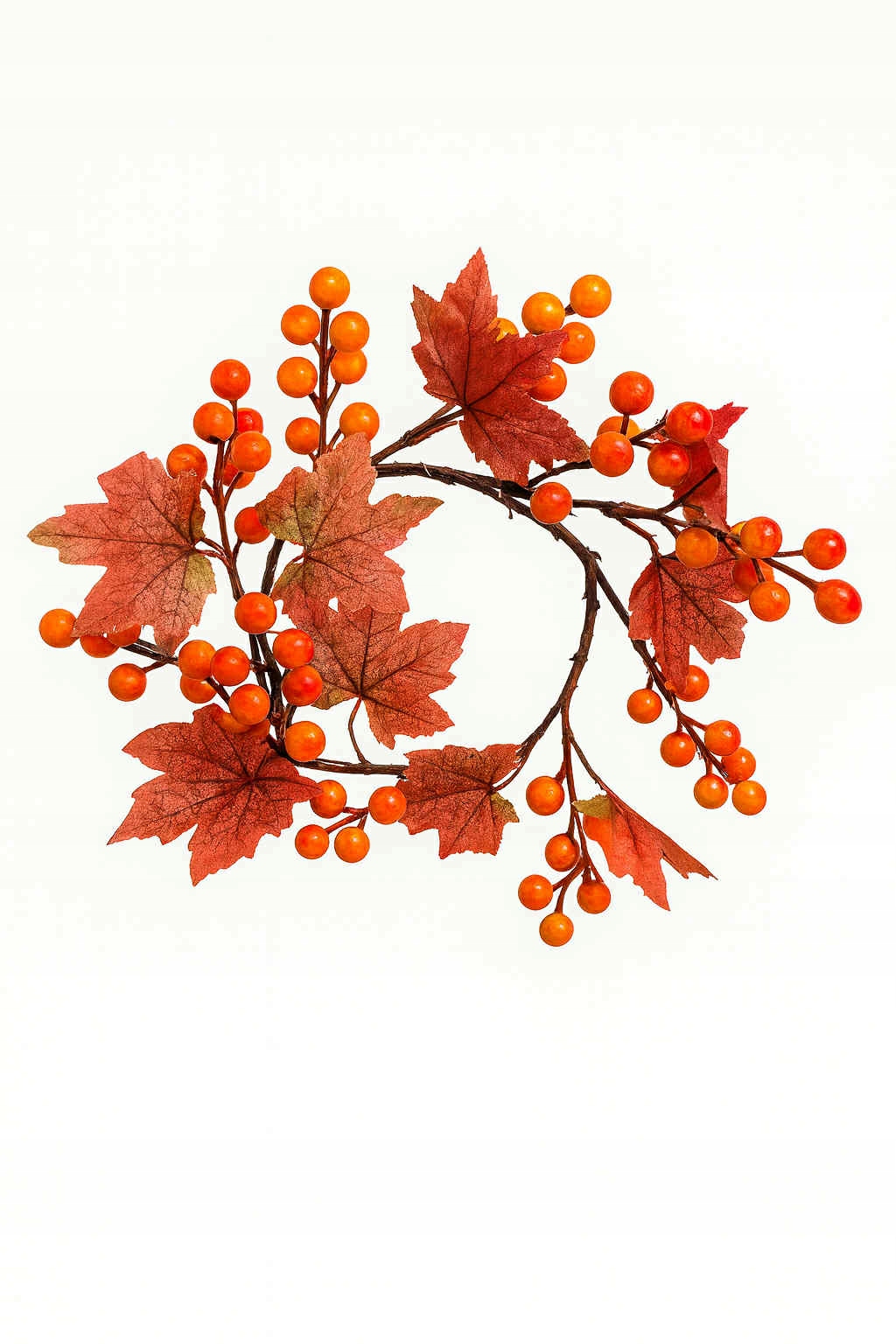Wianek jesienny 14 cm sztuczny z liśćmi i jarzębiną dekoracja stroik świeca